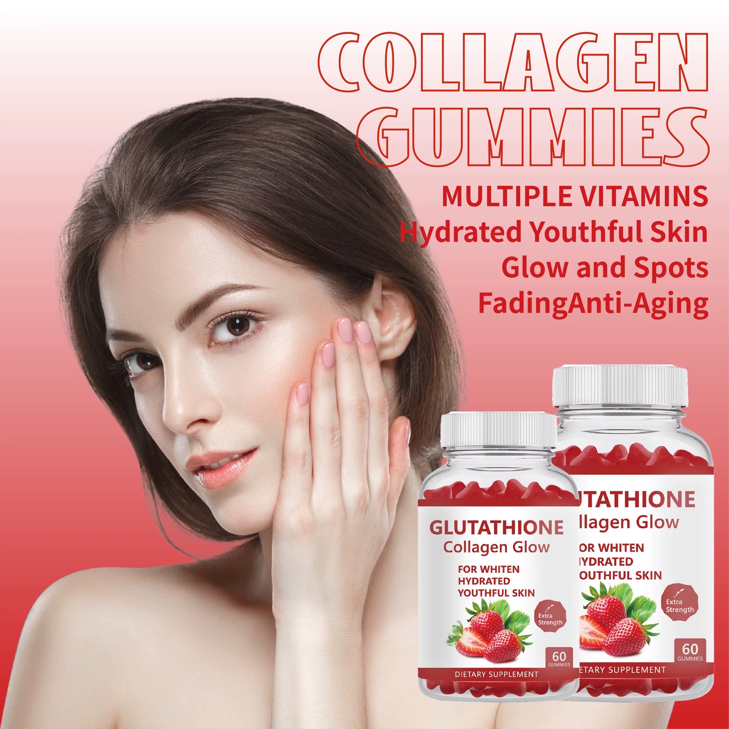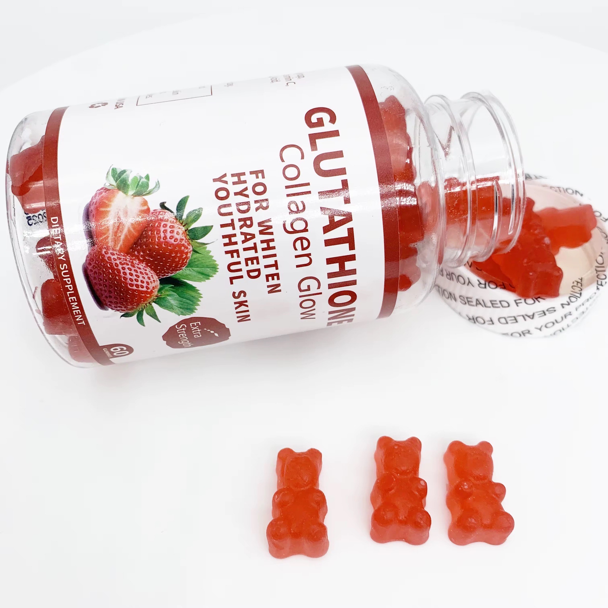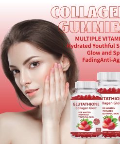 GLUTATHIONE Collagen Gummies Glow , Each package contains 60 gummies that are infused with a delicious strawberry flavor.