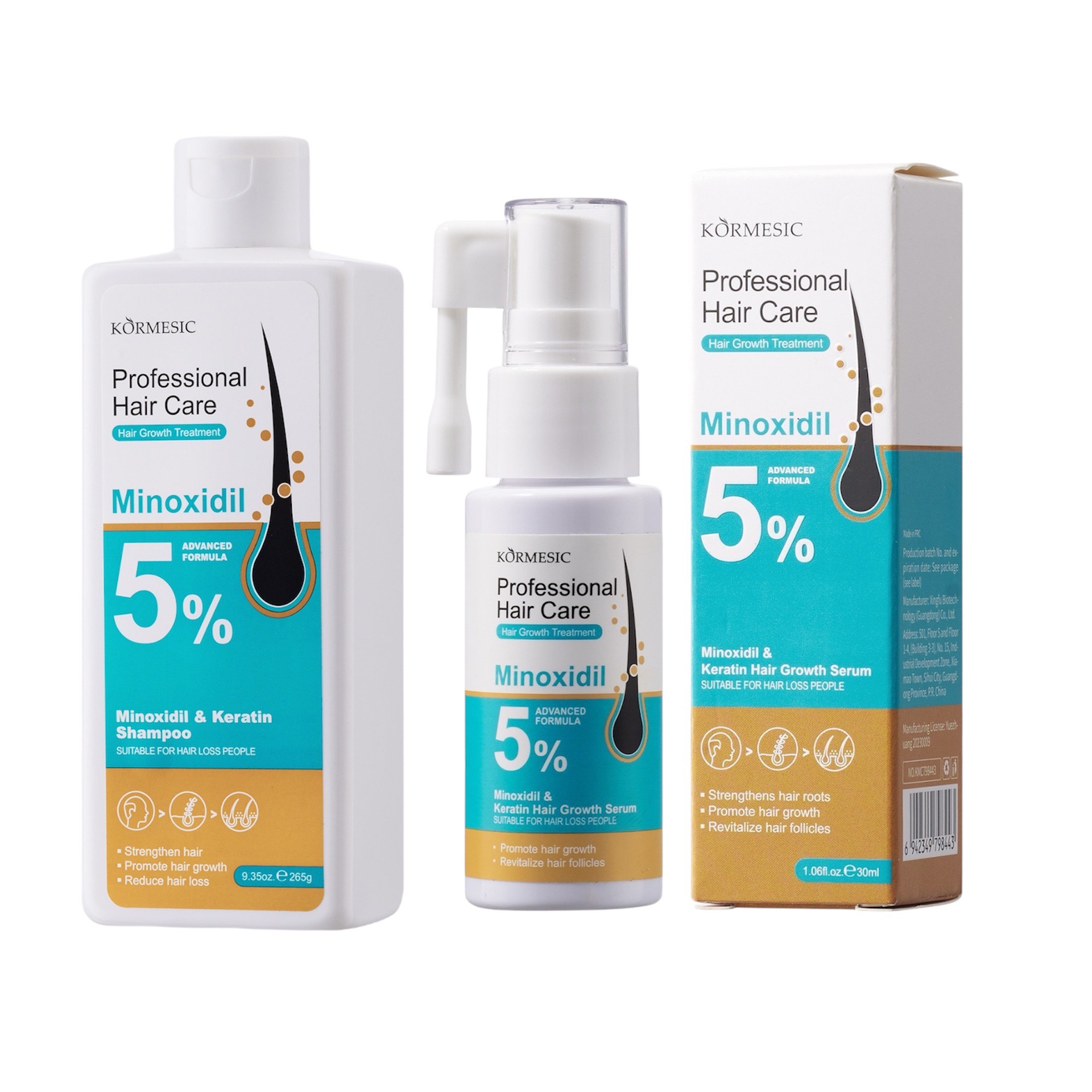 Kormesic Professional Hair Care combines Minoxidil 5% with Keratin in this advanced shampoo and serum set. Specially developed for individuals with thinning hair, this formula helps care for the scalp, strengthen hair strands, and support the appearance of thicker, healthier-looking hair.