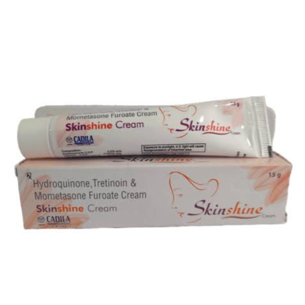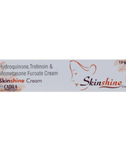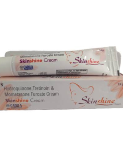 Skinshine Cream is a combination of three drugs: Hydroquinone, Mometasone, and Tretinoin. Hydroquinone belongs to the class of skin-lightening agents that work by decreasing the amount of melanin (a skin pigment) that is responsible for the darkening of the skin. Mometasone is a corticosteroid that acts inside skin cells and inhibits the release of certain chemical messengers in the body that cause redness, itching, and swelling. When the skin reacts to any allergens, such chemicals are released normally. Tretinoin belongs to the class of retinoids (man-made vitamin A) that works by increasing the renewal of skin cells, which helps in the natural exfoliation of the skin’s outer layers. Also, tretinoin loosens the cells on the skin’s surface and unblocks pores by reducing the production of oil in the skin. Thus, it decreases pimples, whiteheads, and blackheads.